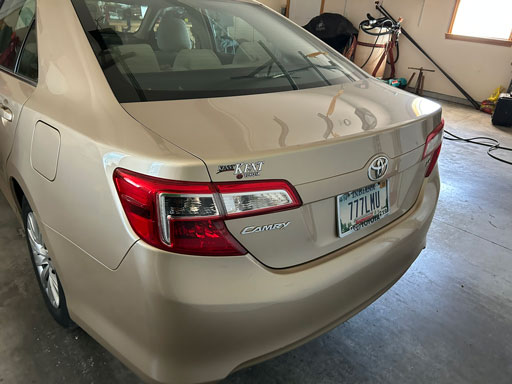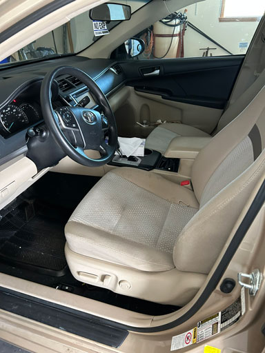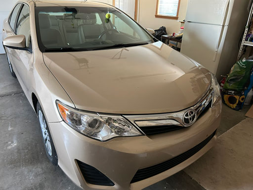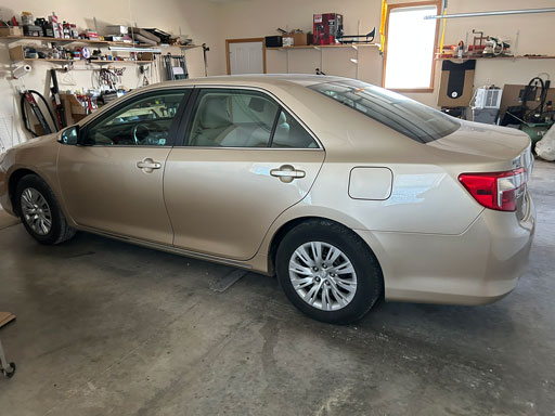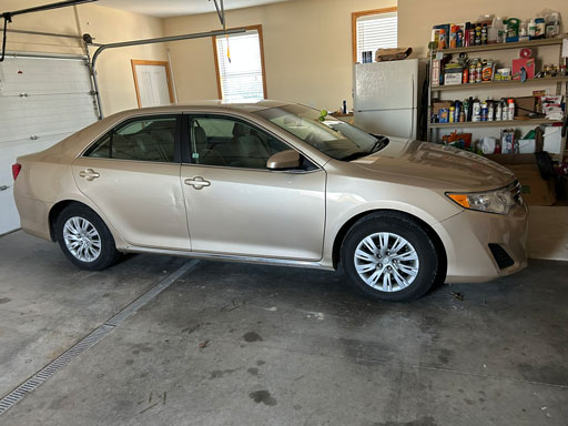 2012 Toyota Camry LE tan 4 door sedan w/power windows, locks, seats, back up camera, 4 cylinder automatic, good tires, tan cloth interior w/black trim. Approx. 135,000 miles. Small passenger side door damage. Selling with modest reserve. VIN: 4T4BF1FK8CR233595.