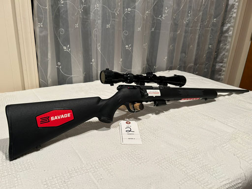 16. Like new Savage Model 93 clip fed semi auto, 22 WMR, checkered stock, sling posts, 20 1/2” barrel, Simmons 4 x 32 variable scope. SN: 0660013.