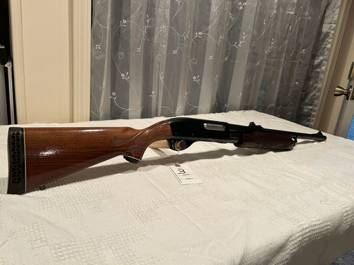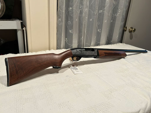 32. Remington Model 1100 semi auto, 12 ga., receiver engraving, scope rail, checkered walnut stock & forearm, 30” vent rib barrel. SN: None.