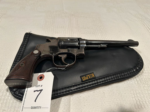 7. Smith & Wesson 38 Spl. 6 shot revolver, blue, walnut grip, w/S & W medallion, 6” barrel. SN: 630235.
