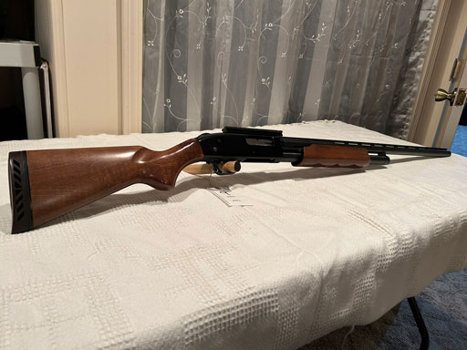22. Mossberg 500, 20 ga. pump, 26” vent rib barrel, checkered walnut stock, gold colored trigger, cuahion butt end. SN: T715451.