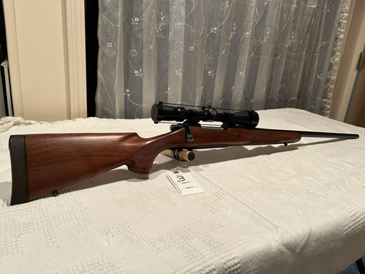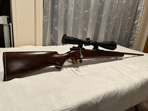 19. Like new Sauer 100, 270 Win. Classic XT bolt action, 21” barrel, checkered black synthetic stock, sling, Simmons 6 – 24 – 50 variable scope, original box, Made In Germany. SN: CO11645.