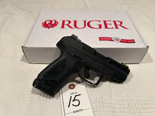 15. NIB Ruger Security Six, .380 semi auto pistol, 3.42” barrel, black synthetic grip, 2 clips, original box. SN:386-95568.