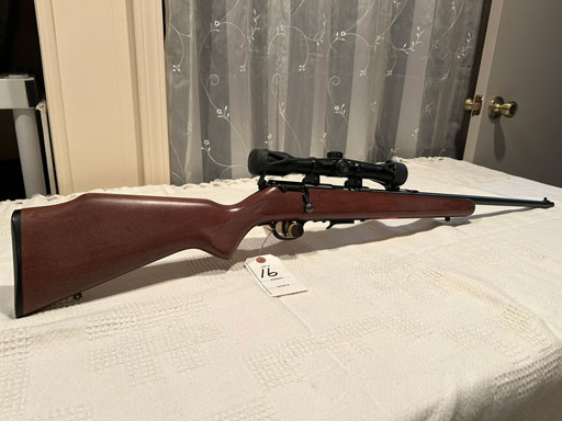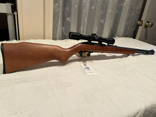 18. Marlin Model 60 Micro Groove, 22LR tube fed semi auto, 18” barrel, Simmons 22 Mag 4 x 32 variable scope. SN: MM37594K.
