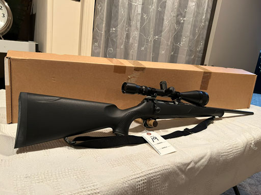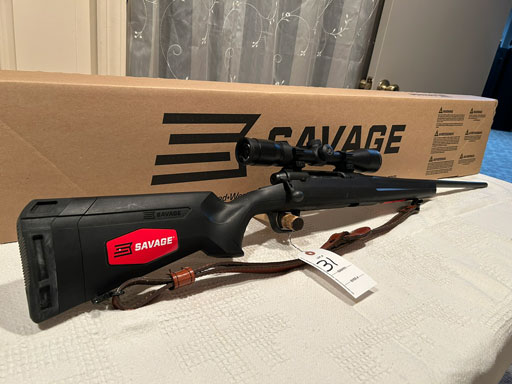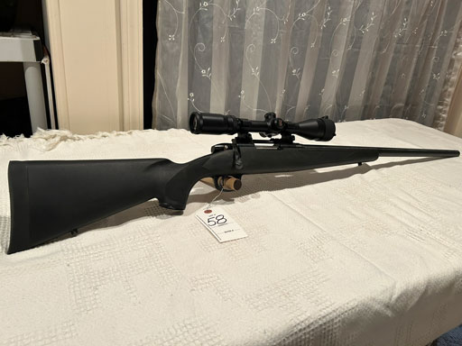 31. Like new Savage Axis 243 WIN. bolt action, black matte 21” barrel, black snythetic stock, leather sling, Votex Diamondback 4 – 12 – 40 variable scope, original box. SN: N124619.