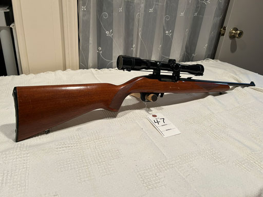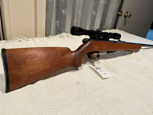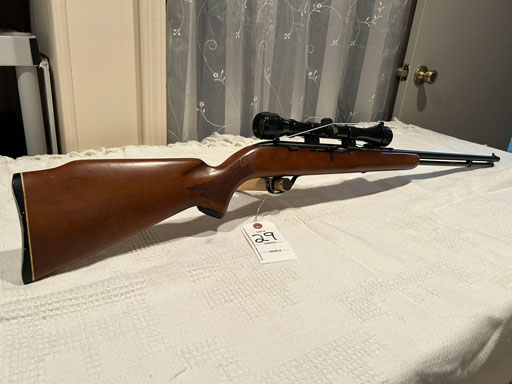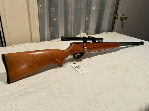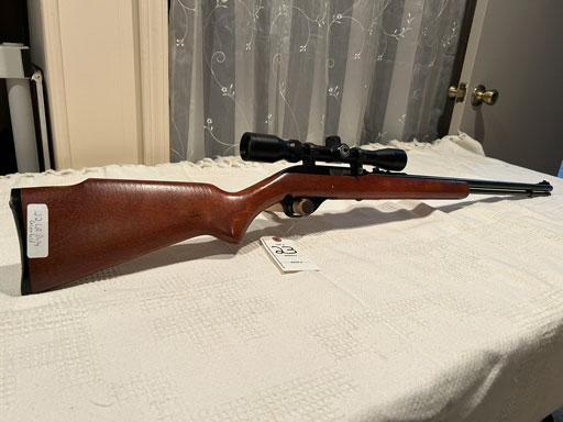 23. Marlin Glenfield Model 60, 22 LR, tube fed semi auto, nice walnut stock, 21 1/2” barrel, Barska 3 – 9 variable scope. SN: 18415382.