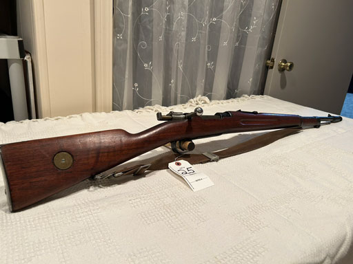 25. Carl Gustafs Stads Gevarsfakori 1915 bolt action M96B 6.5 x 55 Swedish Mauser, ¾ length stock, cleaning rod, 23” barrel w/flash suppressor, canvas sling, Brass Overslag on right hand stock, Matching numbers. SN: KK 360889.