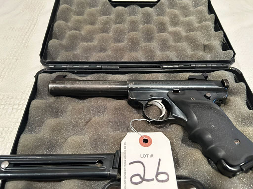 26. Ruger Mark II Target 22 cal. Semi auto, 5 1/2” bull barrel, black rubber grip, plastic carry case. SN: 18-53360.