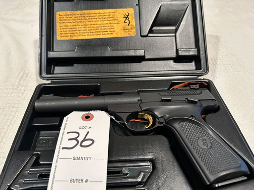 36. Browning Buck Mark 22 LR, semi auto pistol, 5 1/2” Target bull barrel, Target grip, matte black finish, gold colored trigger, original plastic case. SN: 515ZY23177.