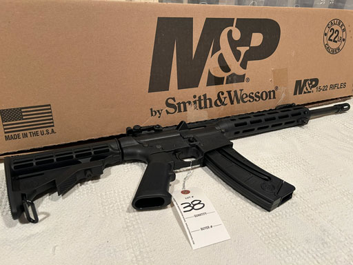 38. NIB Smith & Wesson M & P 15-22, 22LR semi auto rifle, adjustable shoulder, flash suppressor, black synthetic stock, 16 1/2” barrel, original box. SN: LBK8982.