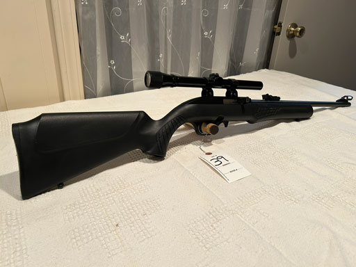 39. Like new Rossi Model RS22, clip fed semi auto 22LR rifle, Hooded glow sights, black synthetic stock, sling posts, 18” barrel, Weaver 4x scope. SN: 7CA25933N.