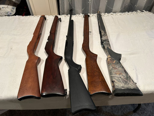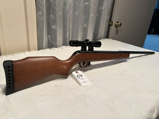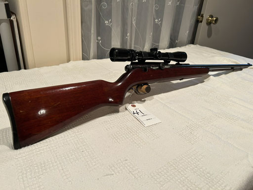 29. Sport King High Standard Model A1041, 22 S, L, LR, tube fed semi auto, checkered grip, 21 1/2” barrel, Maverick 4 x 32 scope. SN: None.