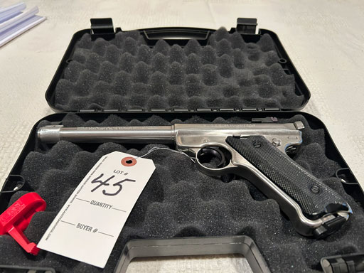 45. Ruger Stainless Mark II Target, 22 LR semi auto pistol, black plastic grips, 7” bull barrel.