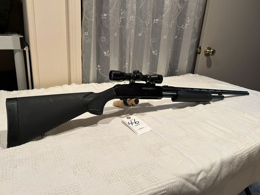 46. Like new Mossberg Model 500E 410 ga., pump shotgun, 24” vent rib barrel, 3” chamber, black synthetic checkered stock, sling posts, Diamond 4 x 32 scope. SN: R258929.
