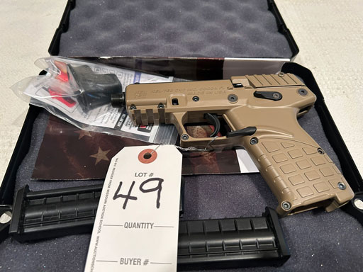 49. Kel Tec P17, 22 LR semi auto clip fed pistol, tan polymer, 4” barrel, 2 clips. SN: 24G1H25.
