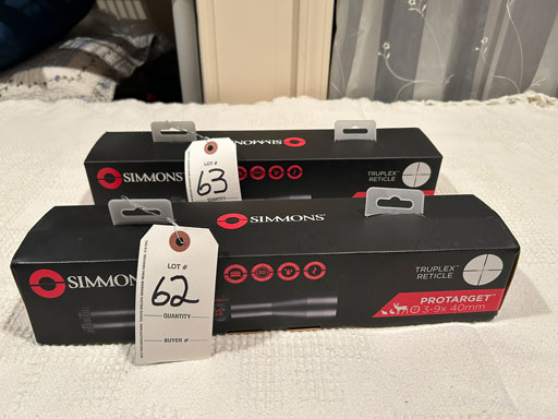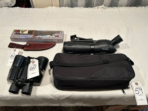 New Vortex Viper HD angled spotting scope, 20-60-85 on King Joy Professional tripod w/original boxes; Choice of 3 Ruger 10/22 barrels; Rugged Gear 20-60mm spotting scope w/tripod; Tasco Basix binos; Chipaway Eagle Bowie Knife w/leather sheath, original box; NIB choice of 2 Simmons Pro Target 3-9-40 rifle scopes; New Vortex Viper HD 20-60-85 angled spotting scope with Kingjoy Pro tripod, original boxes; Choice of 8 rifle scopes including BSA, Bushnell, etc; 2 wooden 6 gun gun cabinets w/sliding glass doors; 2 hard plastic gun cases; 8 soft gun cases; Many new factory and reload boxes of 100, 50, 20 ammo in various calibers from 22 cal. To 30.06; Variety of empty brass lots.