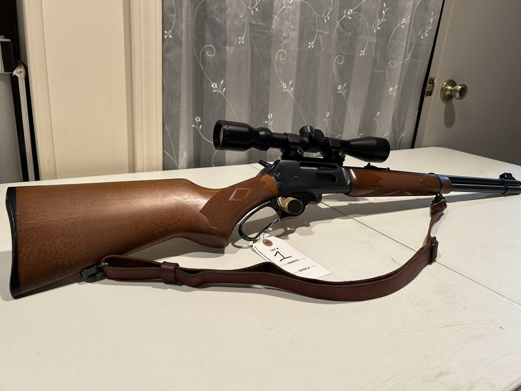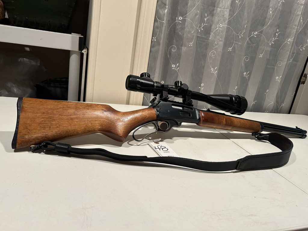 1. Marlin Model 336 W 30-30 lever action, blue w/gold trigger, checkered walnut stock & forearm, 20” barrel, leather sling, Red Head 3-9 x 40 scope. Serial #:98053848.