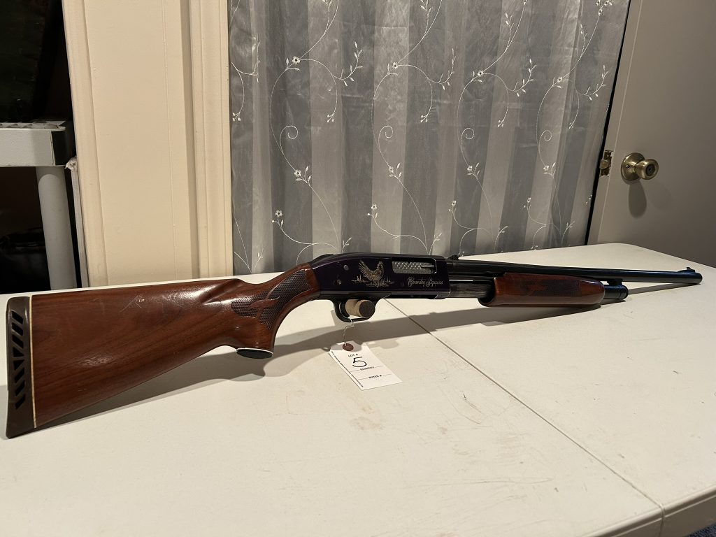 5. Mossberg Model 500AB Deluxe/Engraved Country Squires Youth 12 ga. Pump, 24” Slugster, checkered walnut stock & forearm, 3” chamber. Serial #: G14359.