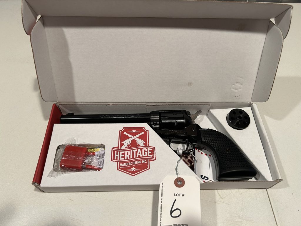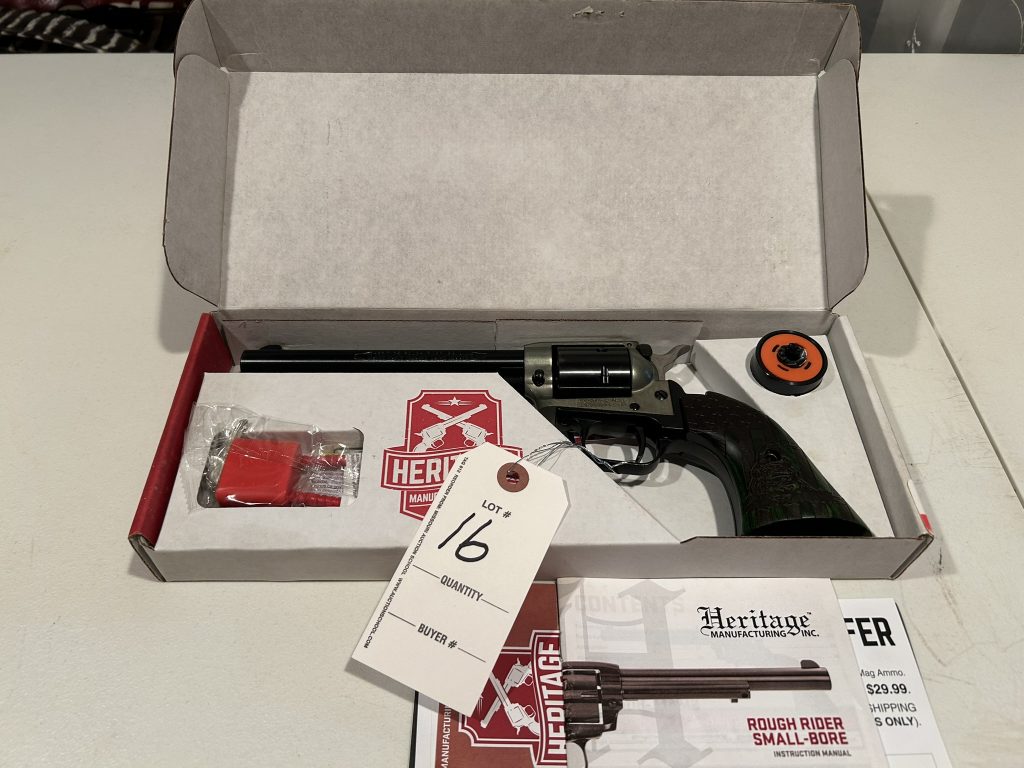 16. NIB Heritage Rough Rider 22/22 magnum, revolver, blue 61/2” barrel, brown & green flag grips. Serial #: 1BH497124.