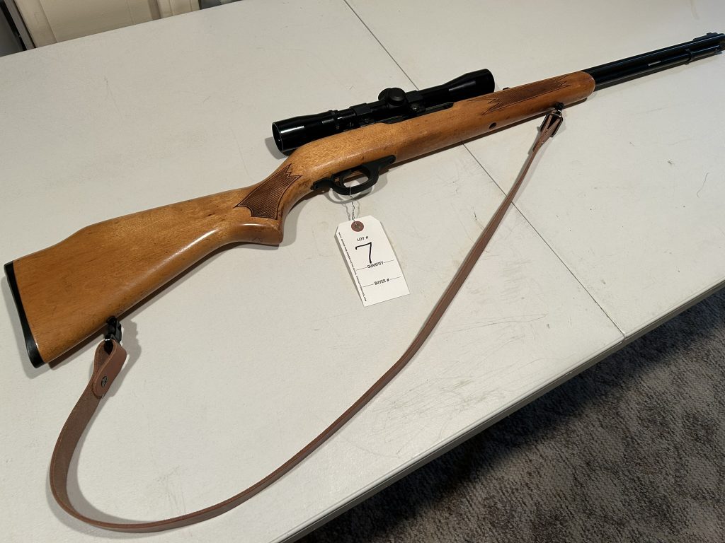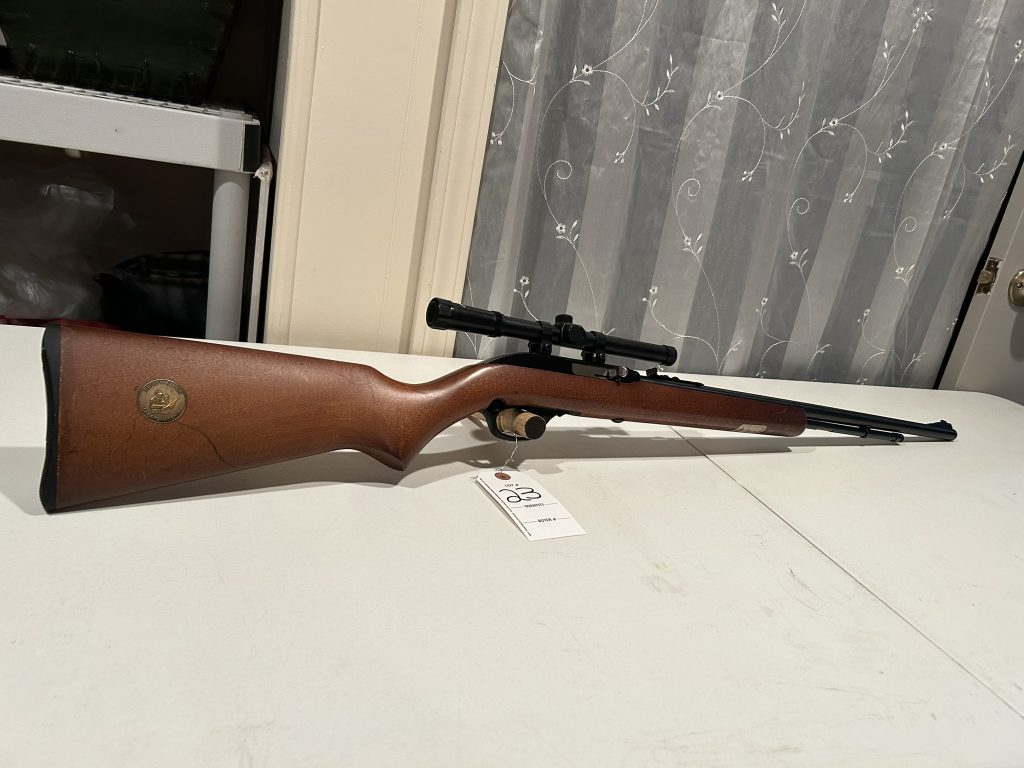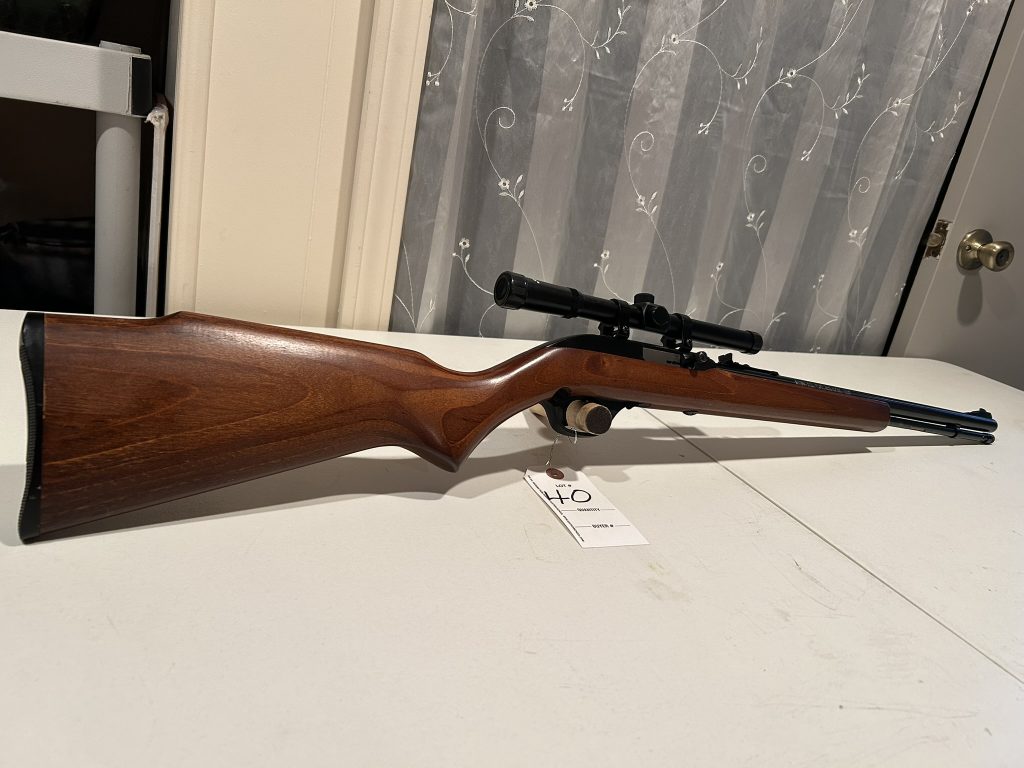 40. Marlin Model 60 22 LR Microgoove semi auto, blue 181/2” barrel, full length mag tube, walnut stock, 4 x 15 scope. Serial #: 96458763.