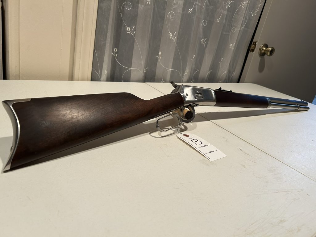 13. Like new Rossi 44 magnum lever action, stainless steel, walnut stock & forearm, 24” octagagroove barrel, full length magazine tube. Serial #: SMO60011.