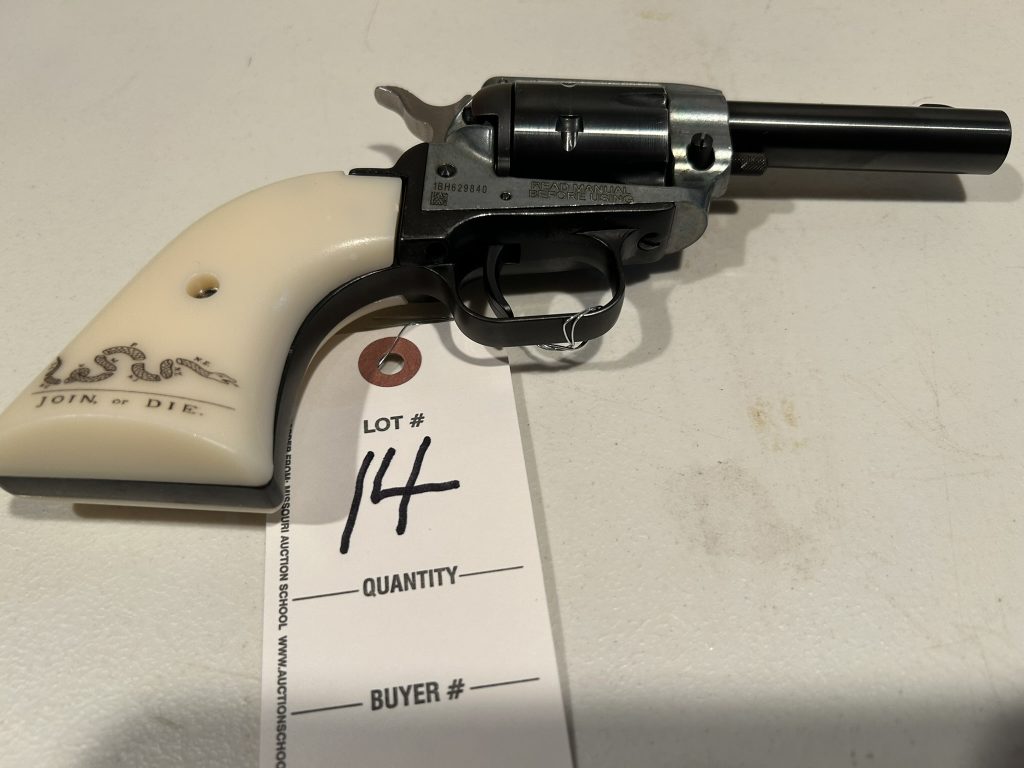 14. Heritage Barkeep 22 cal. Revolver, 31/2” barrel, blue & white plastic grips. Serial #:1BHG29840.