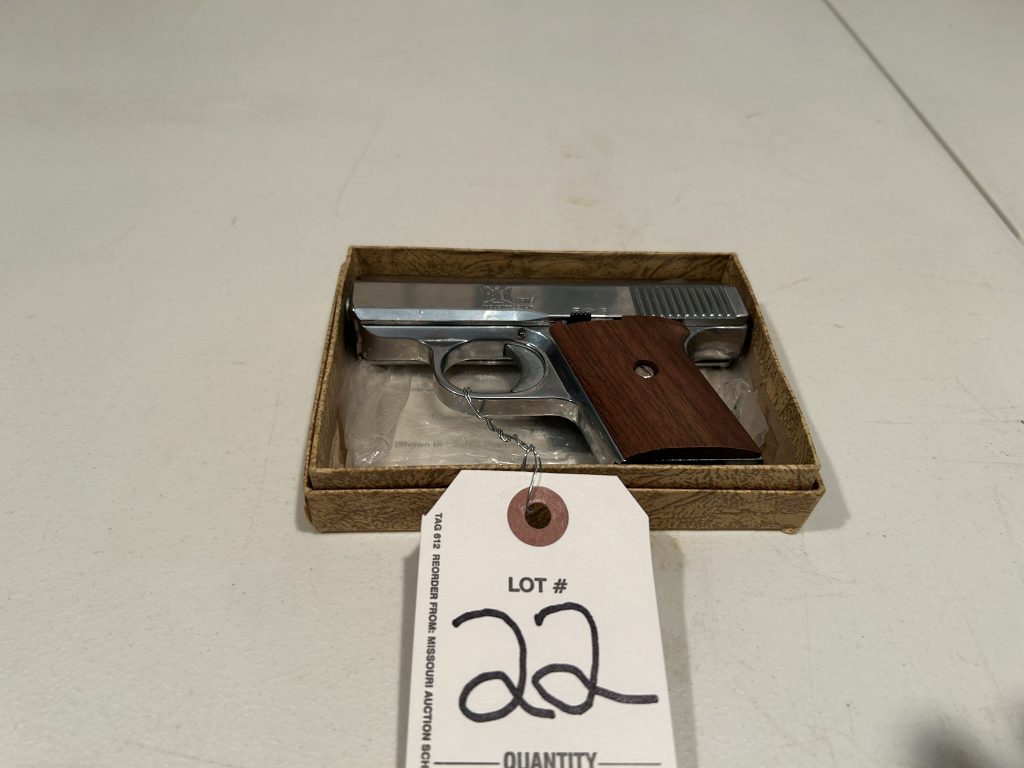 22. Raven Arms Model MP 25 25 cal. Clip fed semi auto, nickle, wood grips, original box.