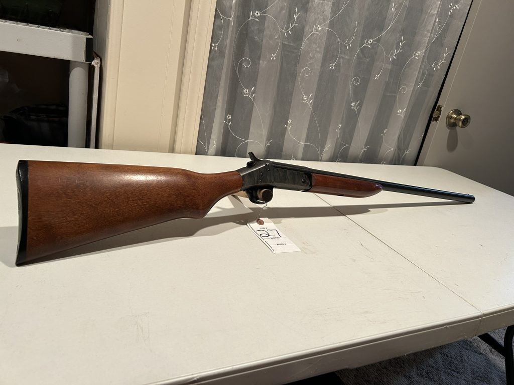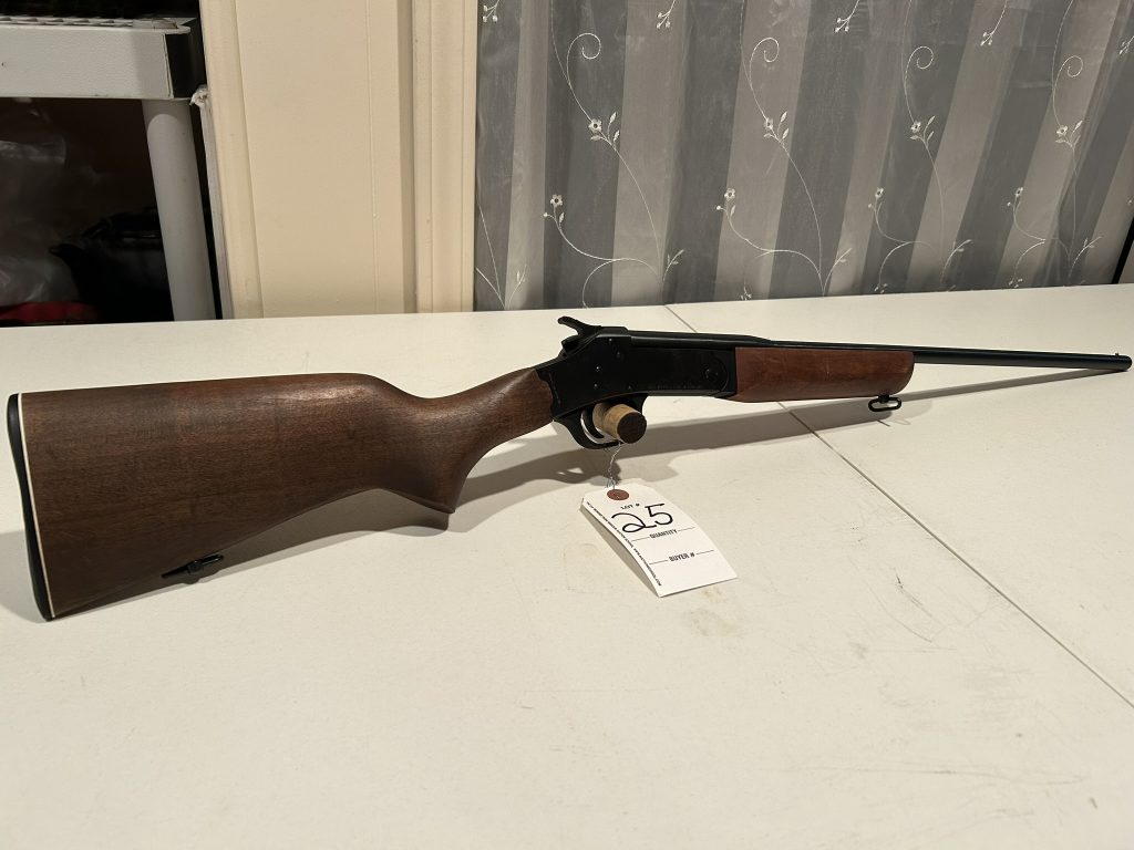 25. Like new Rossi 410 single shot Youth, 3” chamber, blue, sling posts, walnut stock & forearm. Serial #: 12034.