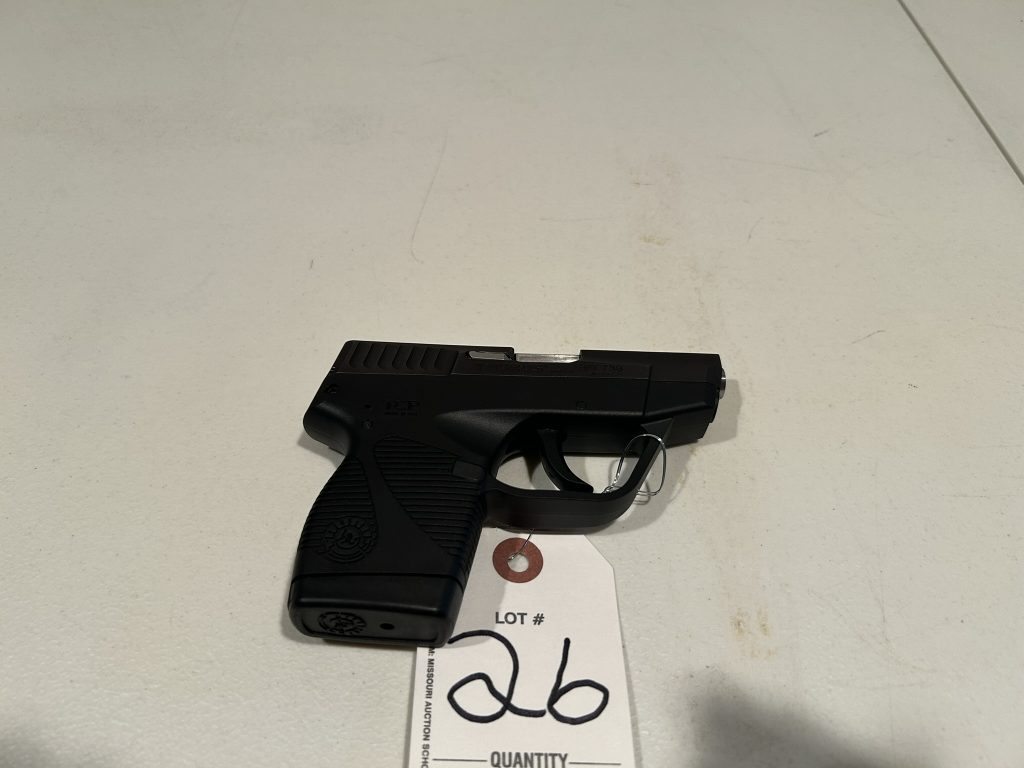 26. Like new Taurus Model PT 738 .380 cal. Clip fed semi auto, black polymer grips, soft case. Serial #: 73049D.