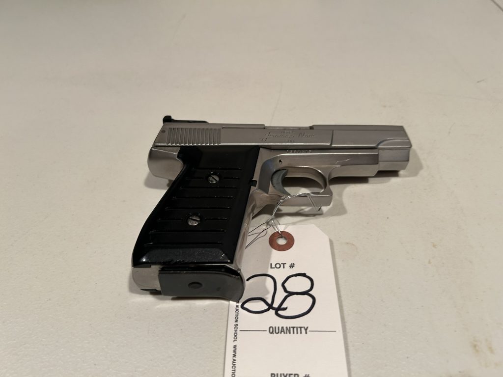 28. Bryco Arms Model Jennings Nine, 9mm semi auto, stainless steel, black plastic grips, 31/2” barrel. Serial #: 1381418.