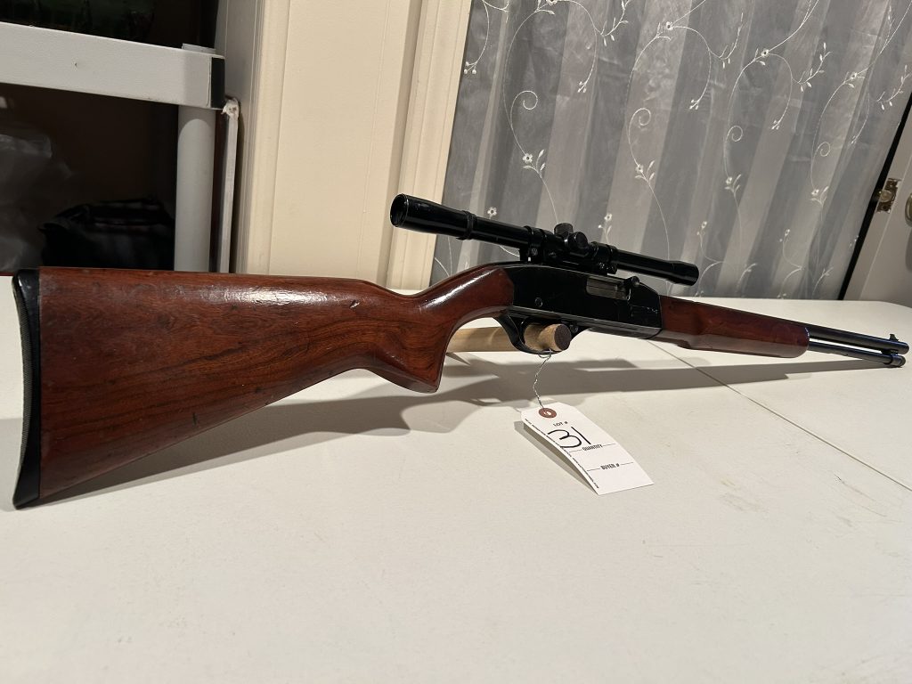 31. Winchester Model 190 22 S, L, LR semi auto, blue 201/2” barrel, full length mag tube, 4 x 15 scope. Serial #: 647521.