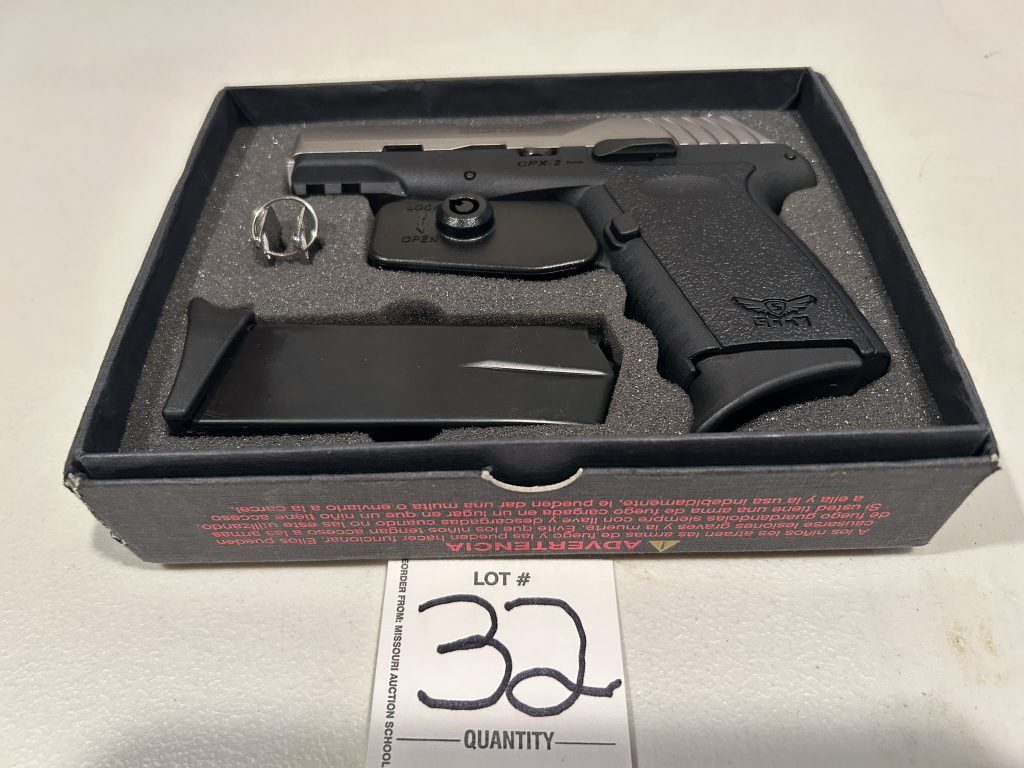32. NIB SCCY CPX2 9mm semi auto, 3” stainless barrel, black polymer grips, 2 clips.