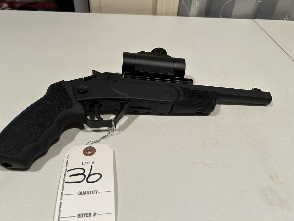 36. Rossi Brawler 410/45 Colt slab sided single shot, 9”barrel, black finish w/rubber grips, Red Dot sites. Serial #:7CD005674.