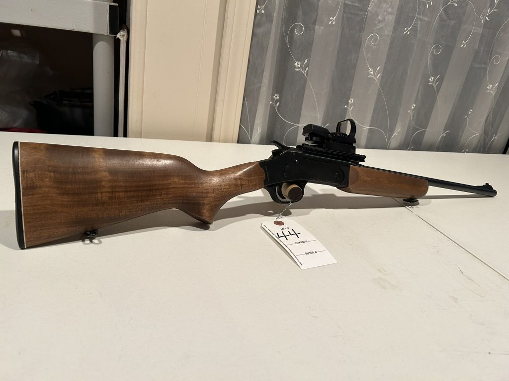 44. Rossi 22 LR single shot, blue 181/2” barrel, Truglow sites, sling posts. Serial #: SP453973.