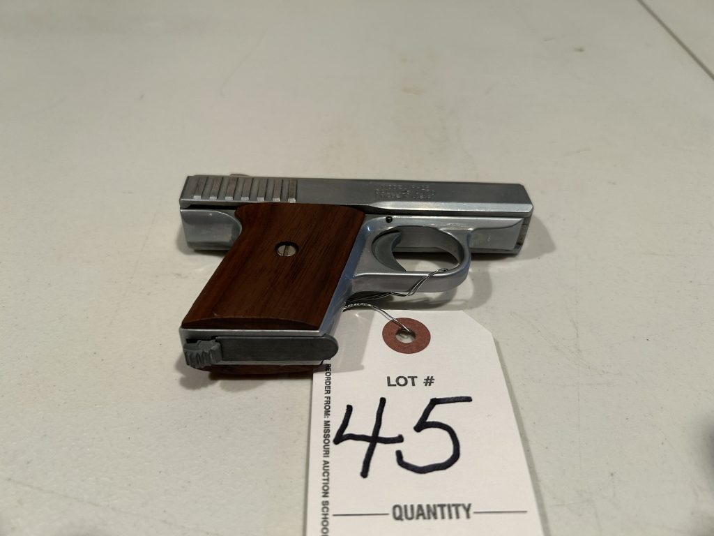 45. Raven Arms Model P25 25cal. Clip fed semi auto, nickle w/wood grips. Serial #: 231867.