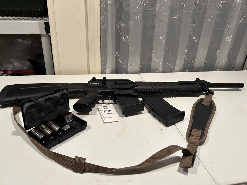 46. Like new Rock Island Arms Home Defense 12 ga. Semi auto, 2 magazines, pistol grip, Picatiny rails, 3 screw in chokes. Serial #: RO32423.