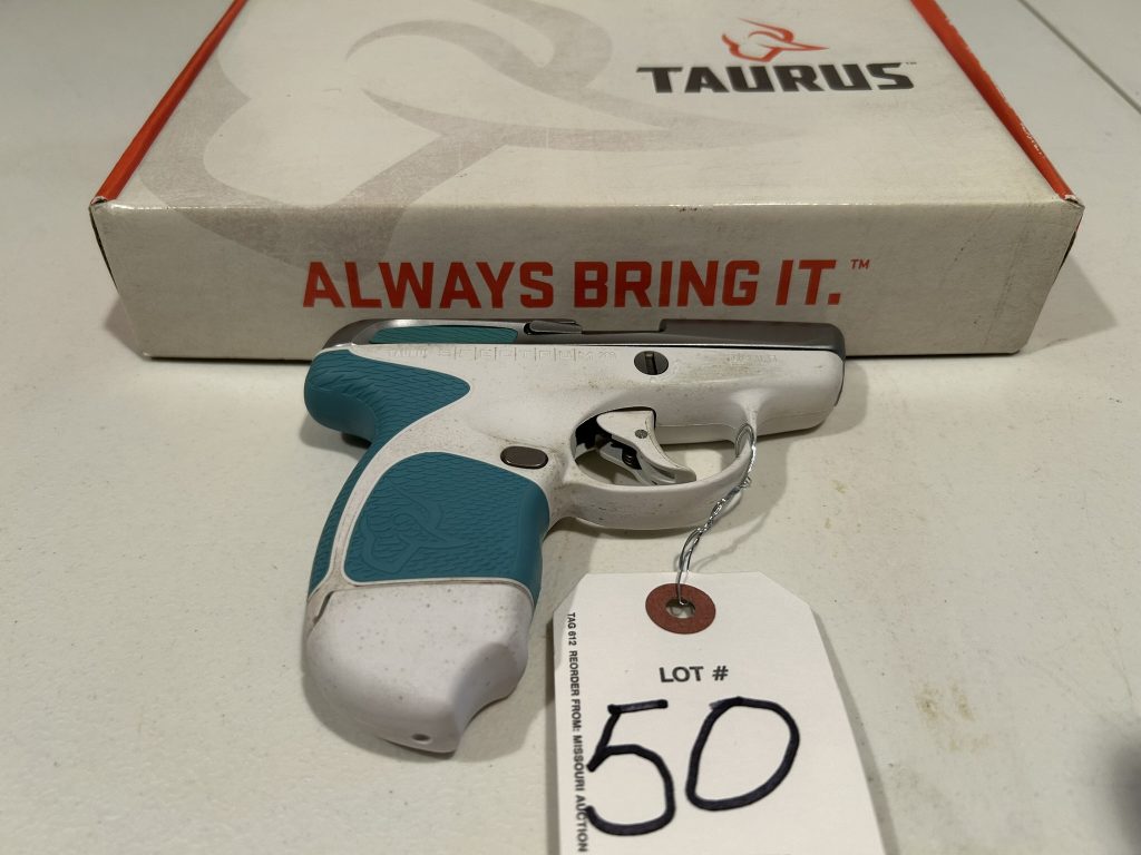 50. Taurus Spectrum 380 clip fed semi auto, 23/4” stainless barrel, white & turquoise, original box, extra clip. Serial #: 1F166098.