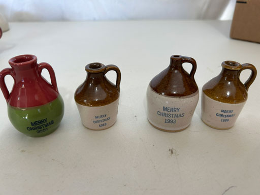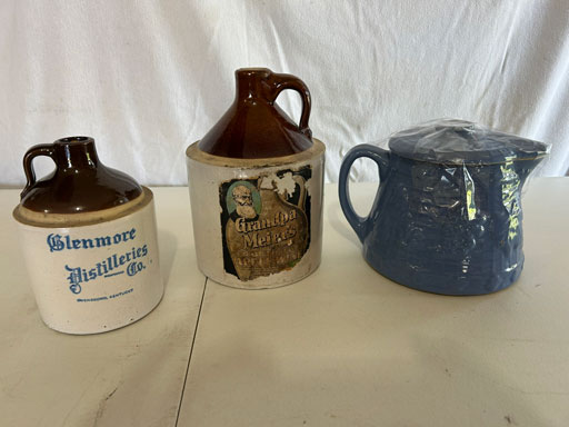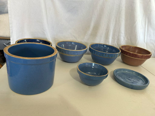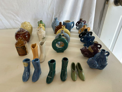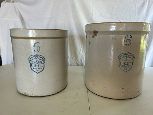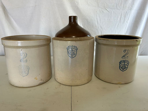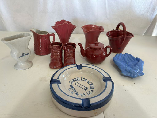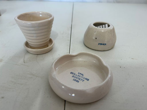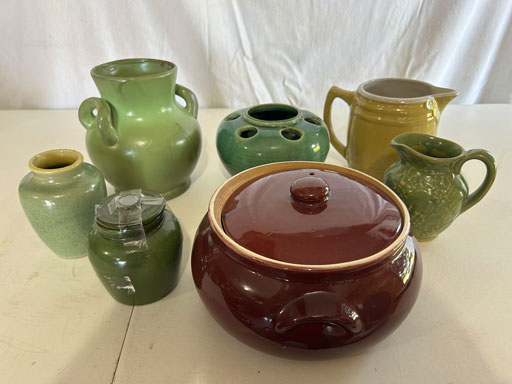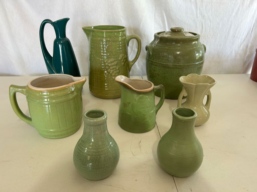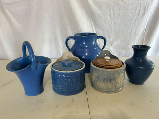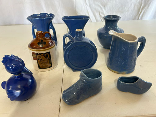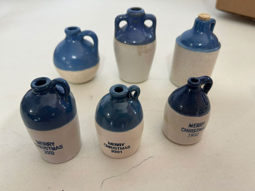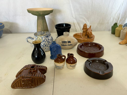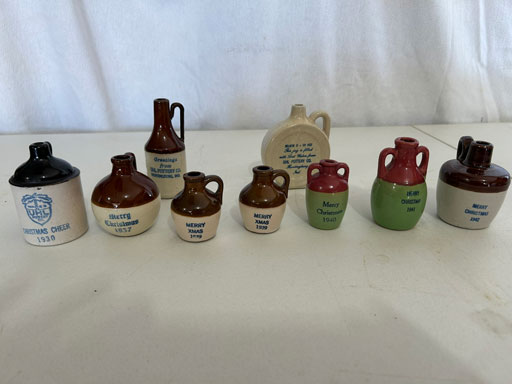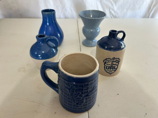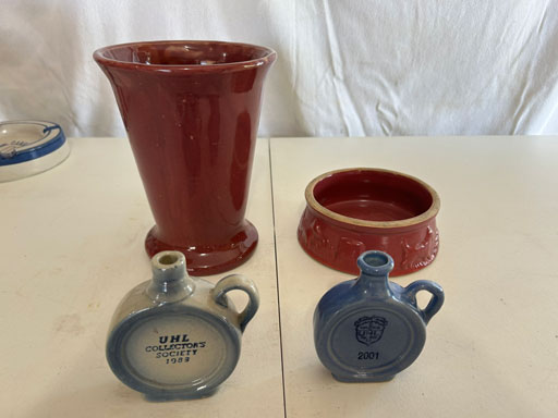 Blue & blue & white wall hung Salts w/lids; 2 – #2, 5 & 6 white crocks; #2 brown & white jugs; rose Scotty Dog food bowl; tan dog & hydrant ashtray; full size blue grape squat pitcher w/lid; blue tied baby shoe; blue 5” canteen jug; 8” bellied jar; 8” blue basket; green grape creamer; green #524 flower frog; Rose #528 casserole w/lid; black ribbed 4: planter; 2 white crock weights; green dbl. handle vase; 4 blue 9” & 4 7” picket fence mix bowls; 2 blue 8” plates; blue flower frog vase; 5 basket weave bowls in different sizes & colors; 6”, 8”, 10” picket fence bowls in different colors; 7”, 8” & 9” blue & white grape pitchers; blue open hands; 8” rose flower vase; 7 rabbit & baskets in different colors; pair rose baby shoes; green cookie jar w/lid; black & rose full size tea pots w/lids; 10” teal Grecian jug; 9” green grape pitcher. Miniatures: Brown Army tank; Fisher ink well; 2 blue & white storage jars w/lids; 2 blue & white churns; horse head jug; pair green slippers; pair green State Fair boots; pair blue boots; tan & white Military boots; 3 octagon jugs; rose 2 cookie jars w/lids; 3 ring jugs; 5 elephant jugs; 2 cat jugs; brown canteen jug; 4 mini barrel mugs; white ribbed flower planter; 1940 Roundup jug; #2 blue Dutch shoe; 4 mini jugs in different styles; 4” blue grape mug. Advertising: Blue & white Cannelton Sewer Pipe ashtray; 2 mini Grandpa Meiers jugs; Huntingburg Legion brown ashtray; Meiers Wine Stube brown ashtray; half gallon Grandpa Meiers jugs; Glenmore Distillery quart jug. Hand Turned: Speckled tan thumb print jug; blue 7” – 3 handle jar; green creamer; green bowl; green vase; black mini vase; green 5” vases; rose 4 dimple vase. Christmas Jugs: 1930, 1937, 2 – 1939, 1940, 1941, 1942 Christmas Jugs; Greetings From Uhl Pottery mini Prunella jug; Greetings From Uhl Pottery mini canteen jug; 2001 green & rose Merry Christmas jug; 1992, 2001, 2002 blue & white Merry Christmas jugs. Commemoratives: 1988 & 2001 blue & white mini canteen jugs; 1991 white mini ashtray; 1994 Dillsboro mini jug; 1995 blue & white churn, complete; 1998 spongeware bean pot w/lid; 1989 football; 1989 & 1993 jugs; 2002 blue & white spongeware Acorn ashtray; 2007 Happy Mothers Day rose basket & tea pot; 2009 blue & white spongeware Lincoln plaque; 2017 Home Sweet Home pitcher; 2021 blue chicken; white fan vase; green & tan bird bath. Lincoln Pitchers: 4” blue Lincoln pitcher; Lincoln creamer; 2 blue & 1green 5”Lincoln pitchers. Vases: Rose & blue #157 fan vases; 3 – 5” blue vases; green #203 vase; blue 7” vase; green dbl. handle vase; #156 blue vase w/handles.