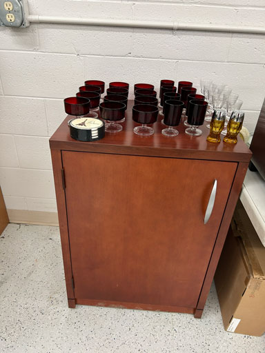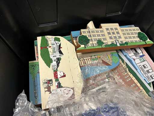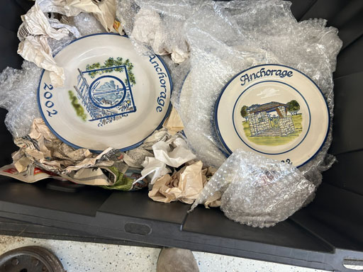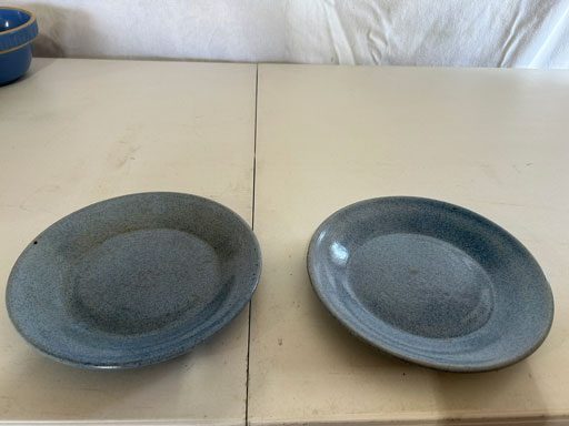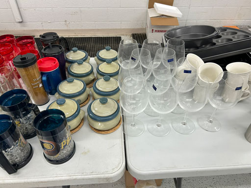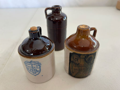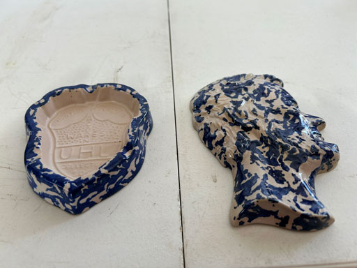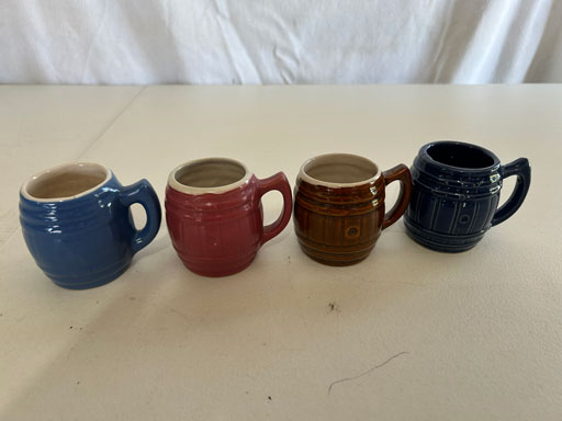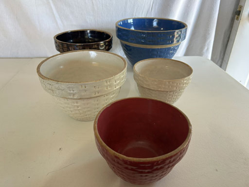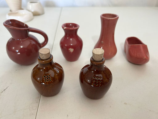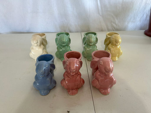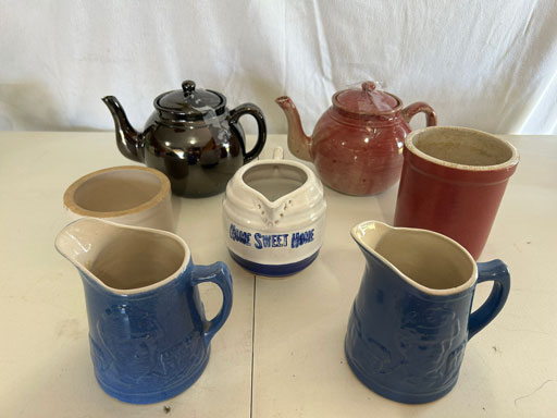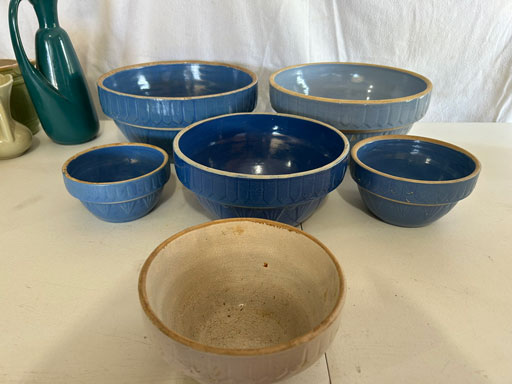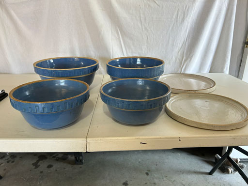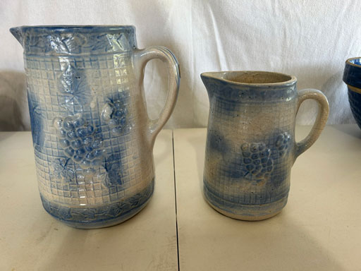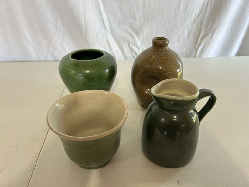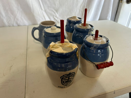 Blue & blue & white wall hung Salts w/lids; 2 – #2, 5 & 6 white crocks; #2 brown & white jugs; rose Scotty Dog food bowl; tan dog & hydrant ashtray; full size blue grape squat pitcher w/lid; blue tied baby shoe; blue 5” canteen jug; 8” bellied jar; 8” blue basket; green grape creamer; green #524 flower frog; Rose #528 casserole w/lid; black ribbed 4: planter; 2 white crock weights; green dbl. handle vase; 4 blue 9” & 4 7” picket fence mix bowls; 2 blue 8” plates; blue flower frog vase; 5 basket weave bowls in different sizes & colors; 6”, 8”, 10” picket fence bowls in different colors; 7”, 8” & 9” blue & white grape pitchers; blue open hands; 8” rose flower vase; 7 rabbit & baskets in different colors; pair rose baby shoes; green cookie jar w/lid; black & rose full size tea pots w/lids; 10” teal Grecian jug; 9” green grape pitcher. Miniatures: Brown Army tank; Fisher ink well; 2 blue & white storage jars w/lids; 2 blue & white churns; horse head jug; pair green slippers; pair green State Fair boots; pair blue boots; tan & white Military boots; 3 octagon jugs; rose 2 cookie jars w/lids; 3 ring jugs; 5 elephant jugs; 2 cat jugs; brown canteen jug; 4 mini barrel mugs; white ribbed flower planter; 1940 Roundup jug; #2 blue Dutch shoe; 4 mini jugs in different styles; 4” blue grape mug. Advertising: Blue & white Cannelton Sewer Pipe ashtray; 2 mini Grandpa Meiers jugs; Huntingburg Legion brown ashtray; Meiers Wine Stube brown ashtray; half gallon Grandpa Meiers jugs; Glenmore Distillery quart jug. Hand Turned: Speckled tan thumb print jug; blue 7” – 3 handle jar; green creamer; green bowl; green vase; black mini vase; green 5” vases; rose 4 dimple vase. Christmas Jugs: 1930, 1937, 2 – 1939, 1940, 1941, 1942 Christmas Jugs; Greetings From Uhl Pottery mini Prunella jug; Greetings From Uhl Pottery mini canteen jug; 2001 green & rose Merry Christmas jug; 1992, 2001, 2002 blue & white Merry Christmas jugs. Commemoratives: 1988 & 2001 blue & white mini canteen jugs; 1991 white mini ashtray; 1994 Dillsboro mini jug; 1995 blue & white churn, complete; 1998 spongeware bean pot w/lid; 1989 football; 1989 & 1993 jugs; 2002 blue & white spongeware Acorn ashtray; 2007 Happy Mothers Day rose basket & tea pot; 2009 blue & white spongeware Lincoln plaque; 2017 Home Sweet Home pitcher; 2021 blue chicken; white fan vase; green & tan bird bath. Lincoln Pitchers: 4” blue Lincoln pitcher; Lincoln creamer; 2 blue & 1green 5”Lincoln pitchers. Vases: Rose & blue #157 fan vases; 3 – 5” blue vases; green #203 vase; blue 7” vase; green dbl. handle vase; #156 blue vase w/handles.