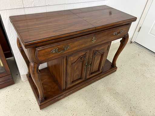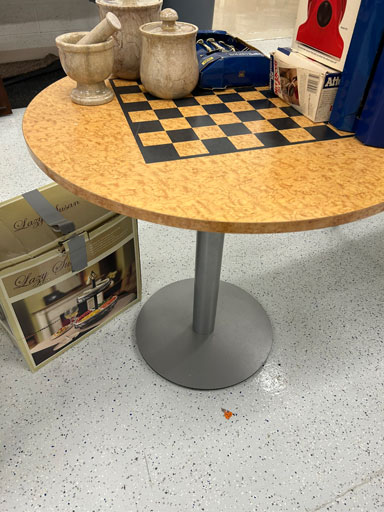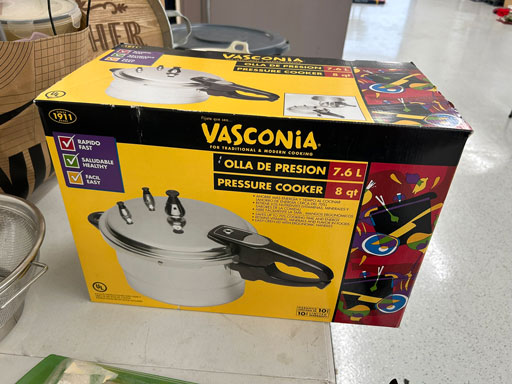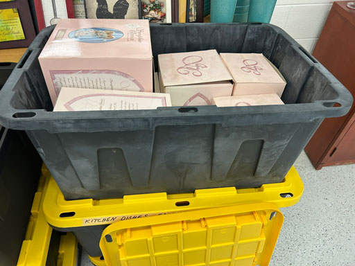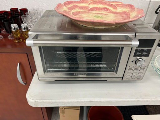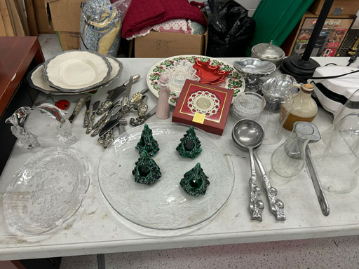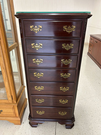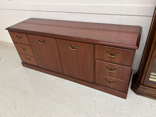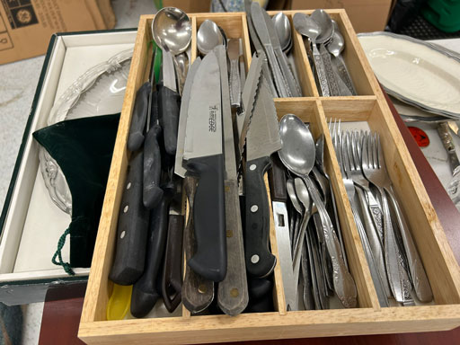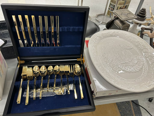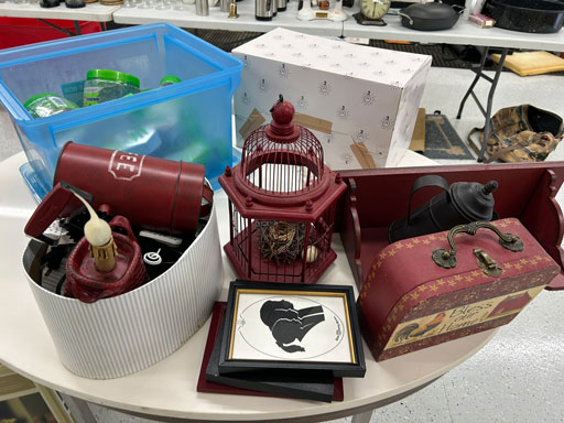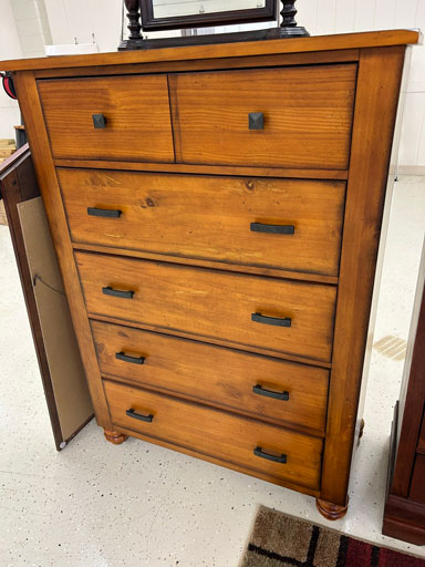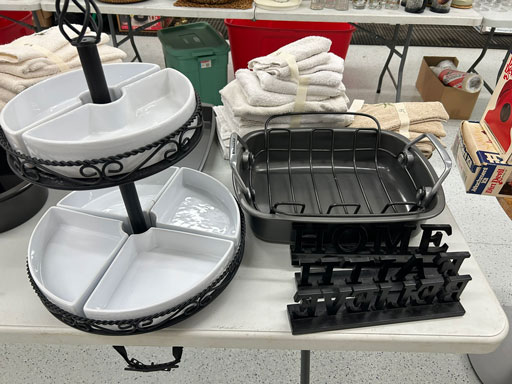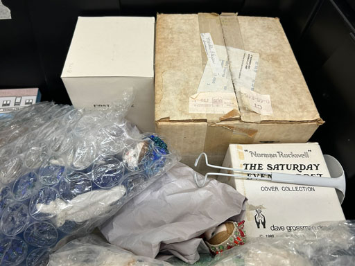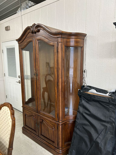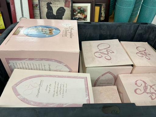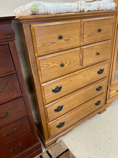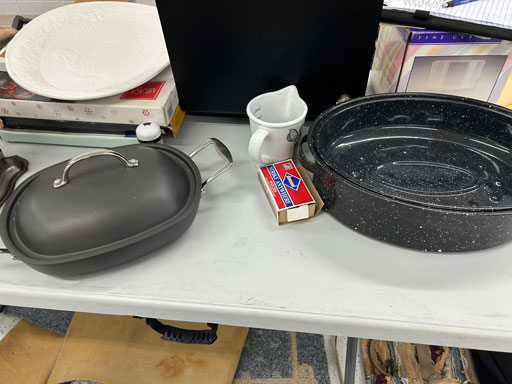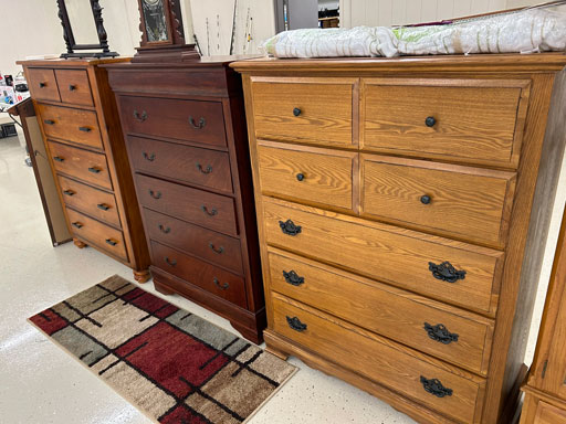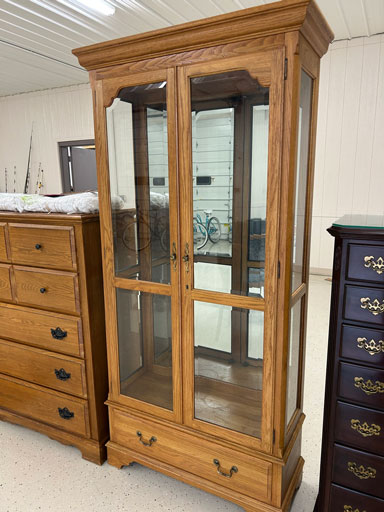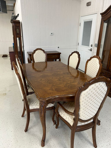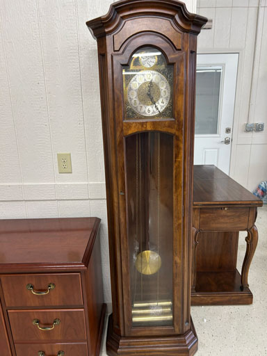 Like new Thomasville pecan finish dining table & 6 cushion chairs, 2 lrg. Leaves; like new Thomasville China lighted cabinet w/bottom storage; side board w/hinged top; walnut grandfather clock; OFS office storage cabinet; Ethan Allen narrow 7 drawer chest; oak rectangular lighted curio cabinet w/bevel glass doors; 3 oak, pine & dark finish 5 drawer chests; small walnut veneer coffee table; walnut 8 day kitchen clock; table top mirror; large wall hung mirror; Optimus 14” digital heater; 2 black electric room heaters; NIB Oster convection oven; 5 NIB portable table top gas & charcoal grills; 2 NIB American Standard garbage disposals; NIB cornhole set; Taylor Made golf bag; many Norman Rockwell figurines in original boxes; many 1997 Jasper Our Heritage village pieces; 28 Seraphine Angels in original boxes; Kitchenaide pots & utensils; 24 Louisville Pottery Anchorage blue & white plates; set of China dinnerware; 10 full boxes cedar grilling planks.