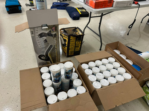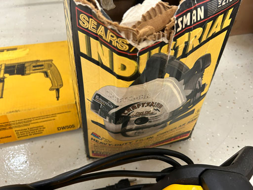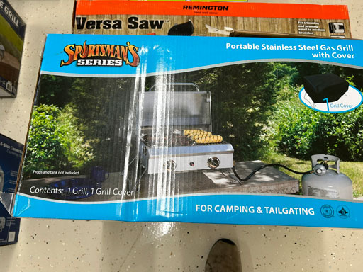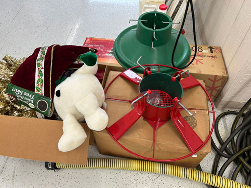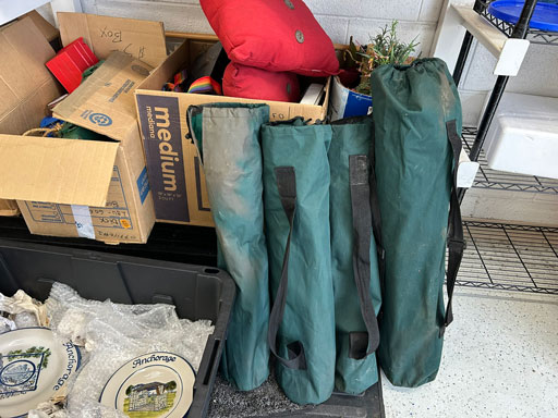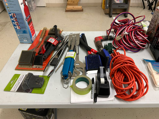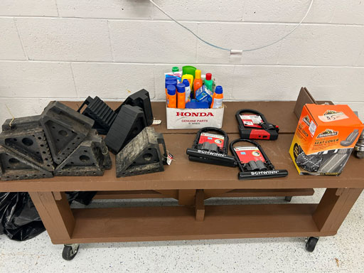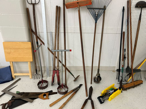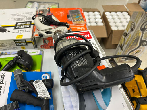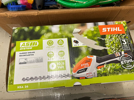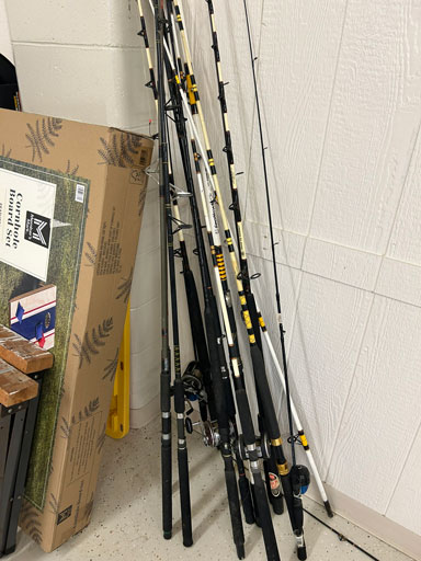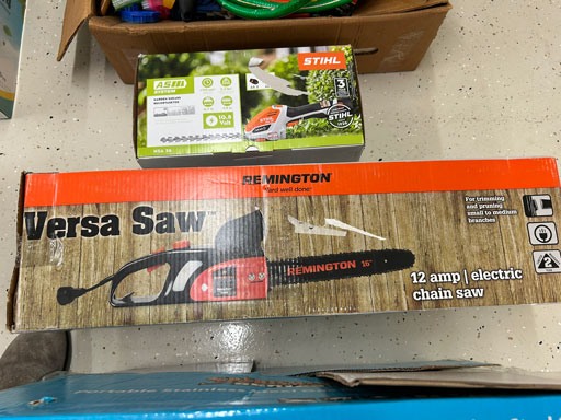 Schwinn aqua color ladies bike; Infinity 10 speed mens’ bike; Schwinn ladies 10 speed bike; set of aluminum & set of wooden truck ramps; 4′ aluminum step ladder;16′ aluminum extension ladder; used front tine 5 hp tiller; NIB Stihl HSA 26 hedge trimmer; NIB Remington 12 amp electric chainsaw; 2 NIB Autojoe inflators; extension cords; NIB Chicago battery charger; 6 ton bottle jack; 2 electric drills; NIB DeWalt 1/2” 2 speed hammer drill; New DeWalt job site radio; Craftsman circular saw; 2 full boxes of 20 cleaning wipes; 10 River/Ocean Rods & Reels; long handle tools.
