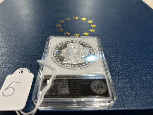 5. 1921 D Morgan silver dollar, slabbed Proof.