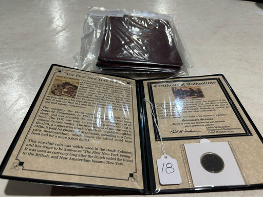 18. Choice of 6 Dutch East Indies copper Duit, First New York penny, in descriptive folder.