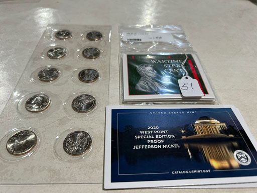 51. 10 State quarters, 2 Wartime 1943 PDS steel penny sets, 2 – 2020 West Point Proof Jefferson nickels.
