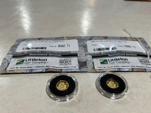 64. 2 – 2023 0.5 grams gold Francs, lion in acrylic rds.