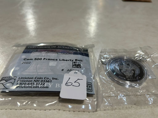 65. 2024 GG Brothers Arms Liberia silver $1 coin in acrylic rd. & Cameo 500 Francs Liberty Bell in acrylic rd.