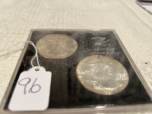 96. 1986 & 1987 American Silver Eagles in acrylic.
