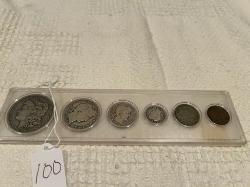 100. Six coin set in acrylic 1885 Morgan, 1925 Barber half, Barber quarter, dime, nickel, Indian head penny.