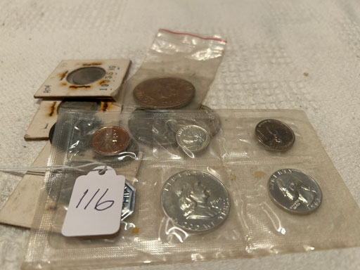 116. 1838 Large cent, 3 Buffalo nickels, 1901 V nickel, Ike dollar, 1965 JFK half, Lincoln Heritage Trail token, 1963 Proof set.
